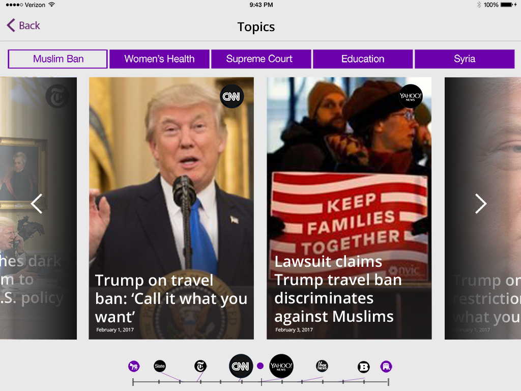 The app draws the day's top stories from six different publications. The publications are ranked according to the majority political affiliation of their consistent readership. These publications, ranked from most left-wing to most right-wing, are: Slate, The New York Times, CNN, Yahoo! News, Fox News and Breitbart.