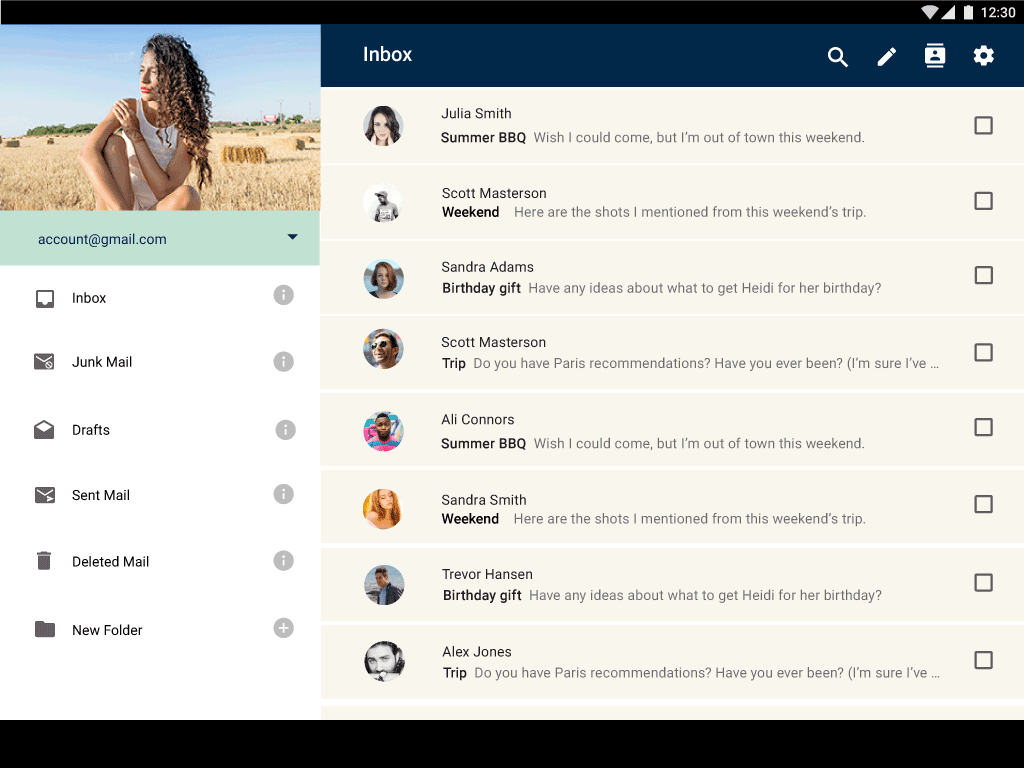 Our design was formed with the concepts of easy accessability. The inbox shows a sidebar, which gives easy access to all folders and accounts.